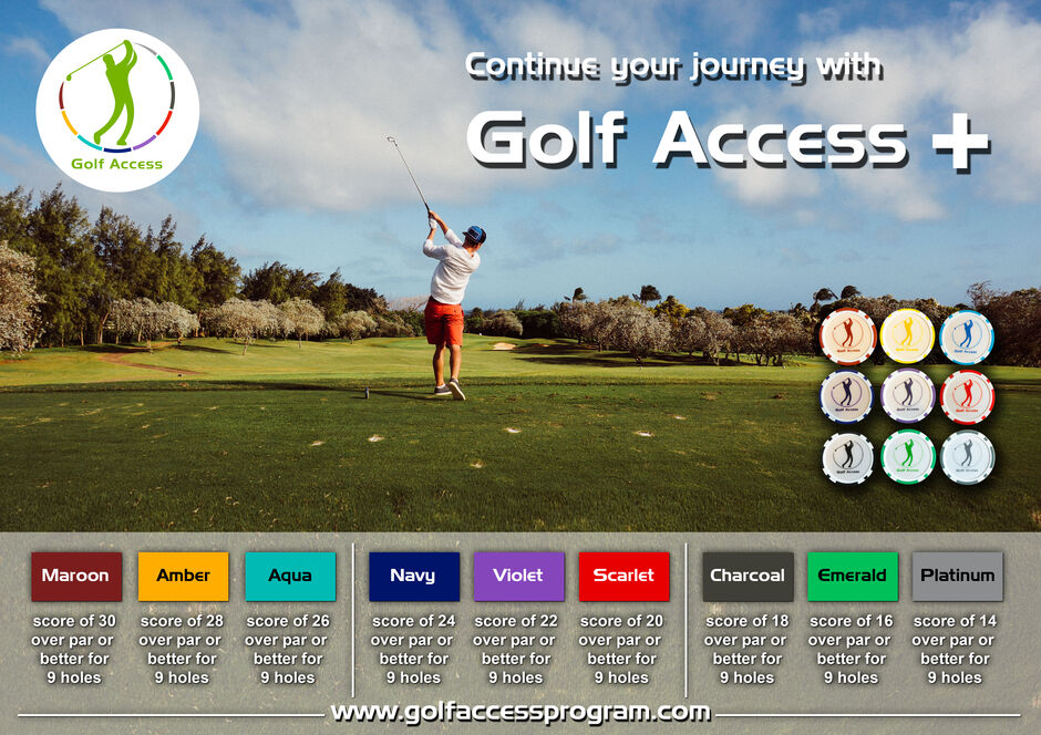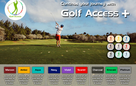 There are 9 different bands / levels for golfers to work through in Golf Access and a participant can progress to the next level as soon as they attain the band score or better. The participant can only move one level at a time after posting a score. All participants will start with the maroon coloured band.